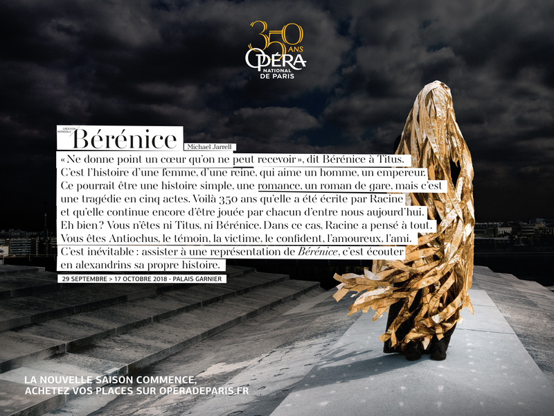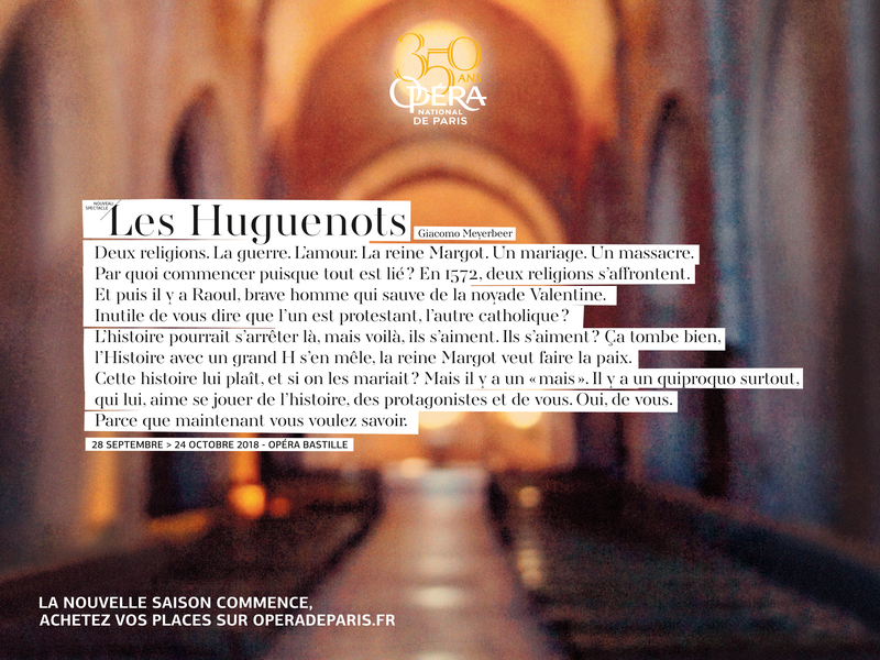 Mais revenons à notre campagne… Pour résumer sommairement sa mécanique, on pourrait dire que chaque visuel magnifie l’intention générale. Et que l’apport rédactionnel installe une histoire, suscite la curiosité, offre la promesse de péripéties palpitantes. Jouant les trouble-fête par son refus de l’esthétisme. Optimisant ainsi sa lisibilité. Sans le texte, avec cette campagne, l’Opéra de Paris servirait son image de marque avec panache. Grâce à lui, il peut espérer une « standing ovation ». Avec l’ambition d’atteindre pleinement son objectif : attirer un public de plus en plus large, le rajeunir, combattre les idées reçues vis-à-vis de l’opéra. En ayant capté l’attention bien au-delà du regard admiratif porté à une image séduisante.