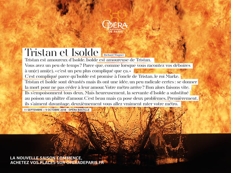 Quand on est rédacteur et que l’on travaille dans le monde de la communication, on entend souvent ce triste refrain : « Ah, vous savez les textes, personne ne les lit ! » Et quand on voit la place prédominante accordée à l’image dans de nombreux supports de publicité, on pourrait finir par croire que ces esprits chagrins ont raison… Une fois pour toute, ne nous fions pas aux apparences. La suprématie de l’image est un leurre. Et dans une campagne réussie, n’en déplaise à certains, les mots comptent souvent doubles ou triples. Comme au Scrabble. Et font au moins toujours jeu égal avec la partie visuelle. La nouvelle campagne de promotion des spectacles de l’Opéra de Paris nous en offre la plus parfaite illustration.