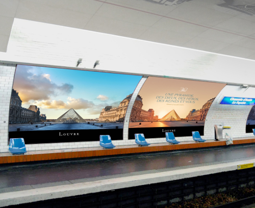 Trois visuels à la facture plutôt classique composent le tableau complet. Donnant à admirer l’esplanade du Louvre, lieu désormais mythique, au rythme d’une journée qui s’écoule. Avec un traitement de la lumière empreint de subtilité et de délicatesse. Une manière habile d’exprimer l’intemporalité et l’inépuisable attrait du Louvre, quels que soient l’heure ou l’instant. À l’arrière-plan, des ciels changeants permettent à la mise en scène générale de monter en puissance. En les scrutant, on peut y lire des signes tangibles du bonheur absolu, de l’exaltation liée à la beauté, de l’inquiétude qui précède le drame, de l’implacable froideur du crépuscule des dieux. Un avant-goût des plaisirs et des sensations que réserve le musée.