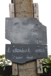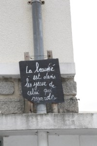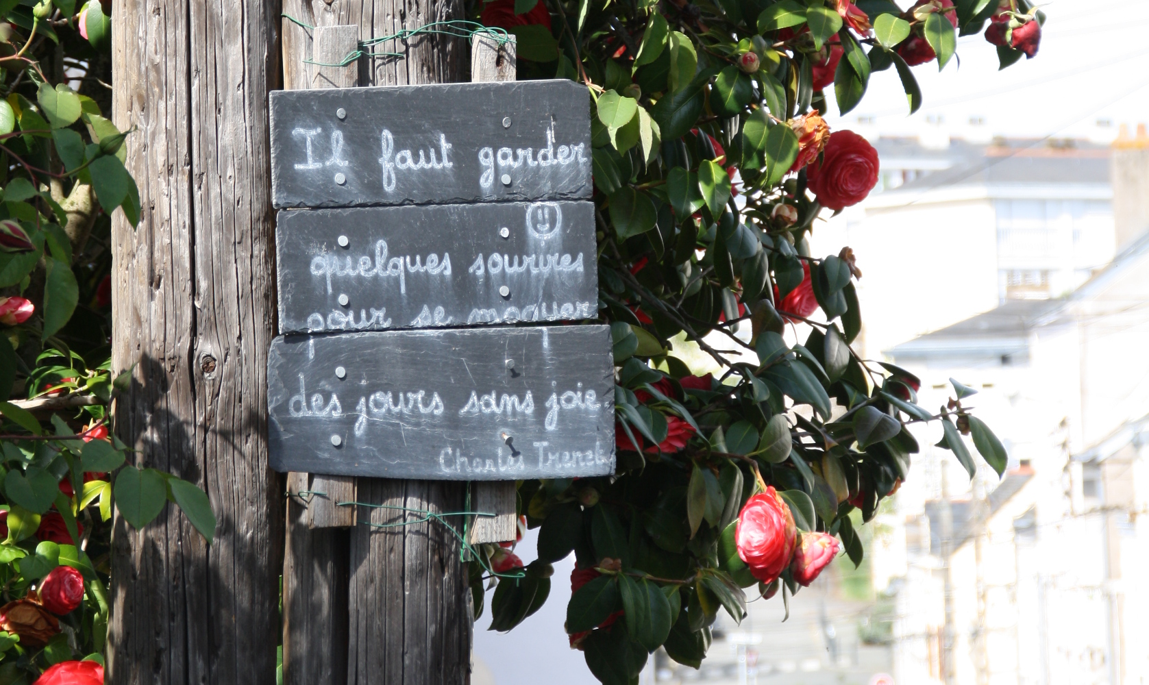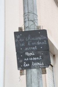 électriques et aux parties saillantes qui composent les habitations, des ardoises presque brutes (nous sommes en Anjou) déploient citations et autres phrases célèbres afin d’attirer votre regard mais plus encore, votre attention. À la lecture de ce drôle de recueil littéraire (ou pas), on ressent immédiatement une sensation de bien-être et de bienveillance qui finit par vous submerger littéralement. Rue d’Antioche : un seul danger vous guette, celui qui consiste à ne plus regarder où vous marchez !