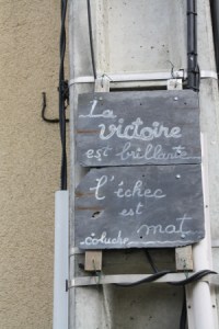 Loin des panneaux digitaux qui prolifèrent ça et là, objets tout en lumières agressives et en slogans chics et chocs à consommer en un éclair, notre drôle d’affichage se mérite et se savoure dans la durée. Comme je l’ai précisé un peu plus haut, il faut d’abord lever la tête pour remarquer la présence des ardoises. Puis ouvrir l’œil très très grand quand on veut lire les messages qu’elles conservent jalousement. À ce propos, on comprendra aisément que la craie, moyen si poétique et si écologique de communication et d’écriture, puisse voir l’intensité de son trait s’altérer au fil du temps et des intempéries.