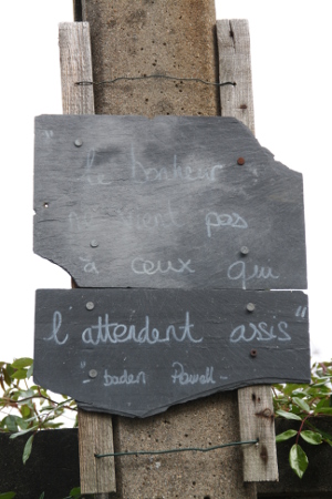 moquer des jours sans joie. » (ma citation préférée, elle est de Charles Trenet), « Vivre ce n’est pas attendre que l’orage passe, vivre c’est apprendre à danser sous la pluie. » (pas si facile à faire quand on y réfléchit bien), « Si on veut connaître un peuple, il faut écouter sa musique. » signé Platon, « La victoire est brillante, l’échec est mat. » affirmait Coluche lui si brillant qu’il nous manque encore… Et que diriez-vous d’une petite leçon de vie plus pertinente que moralisante assénée par Baden Powell ? « Le bonheur ne vient pas à ceux qui l’attendent assis. ». Comprenne qui voudra… Allez, une dernière pour la route ou pour la rue (!) : « Il en faut peu pour être heureux. »